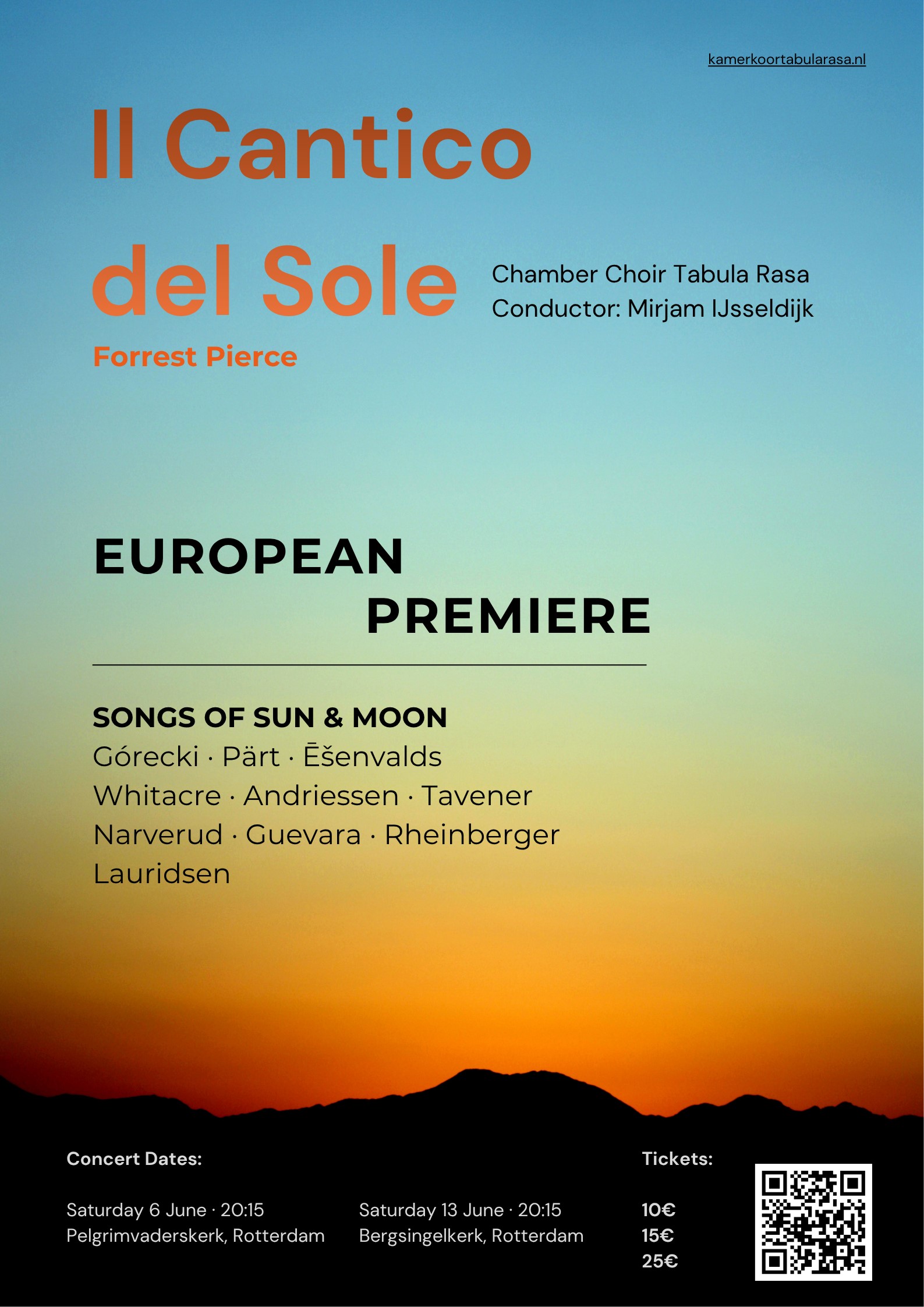 Kamerkoor Tabula Rasa brengt de Europese première van 'Il Cantico del Sole' van de Amerikaanse componist Forrest Pierce, op de beroemde teksten van Franciscus van Assisi. Daarnaast bezingt het koor de zon en maan in werken van o.a. Pärt, Whitacre, Lauridsen, Tavener, Gorecki, Esenvalds en Andriessen.